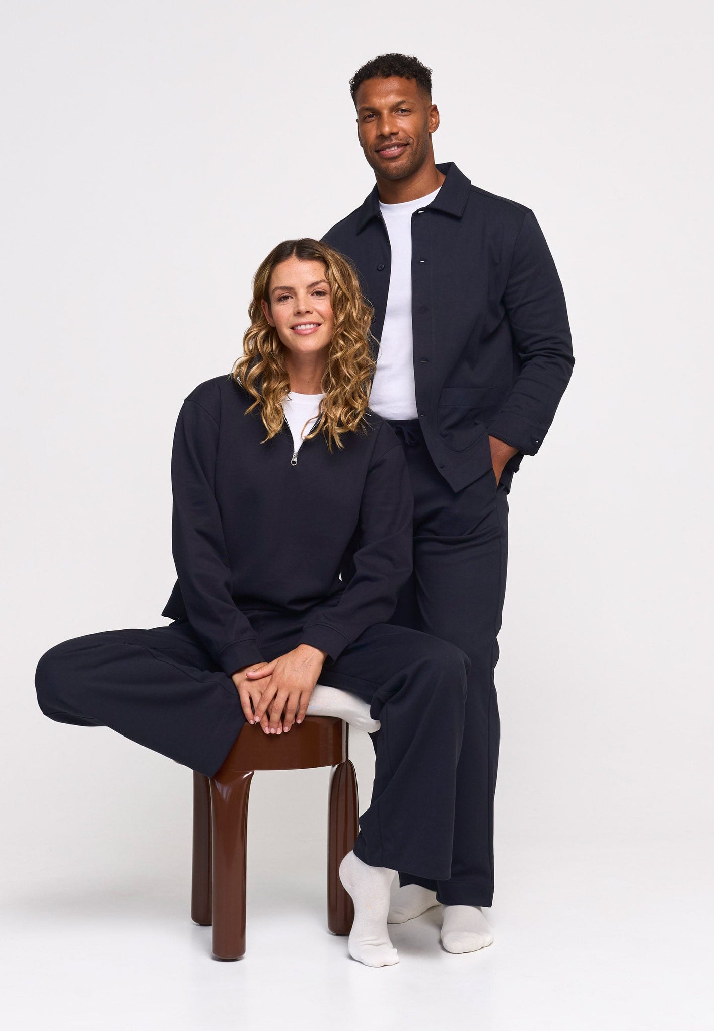 Half-zip sweater in mid-weight interlock jersey, ideal for travel. Relaxed fit, slightly cropped.