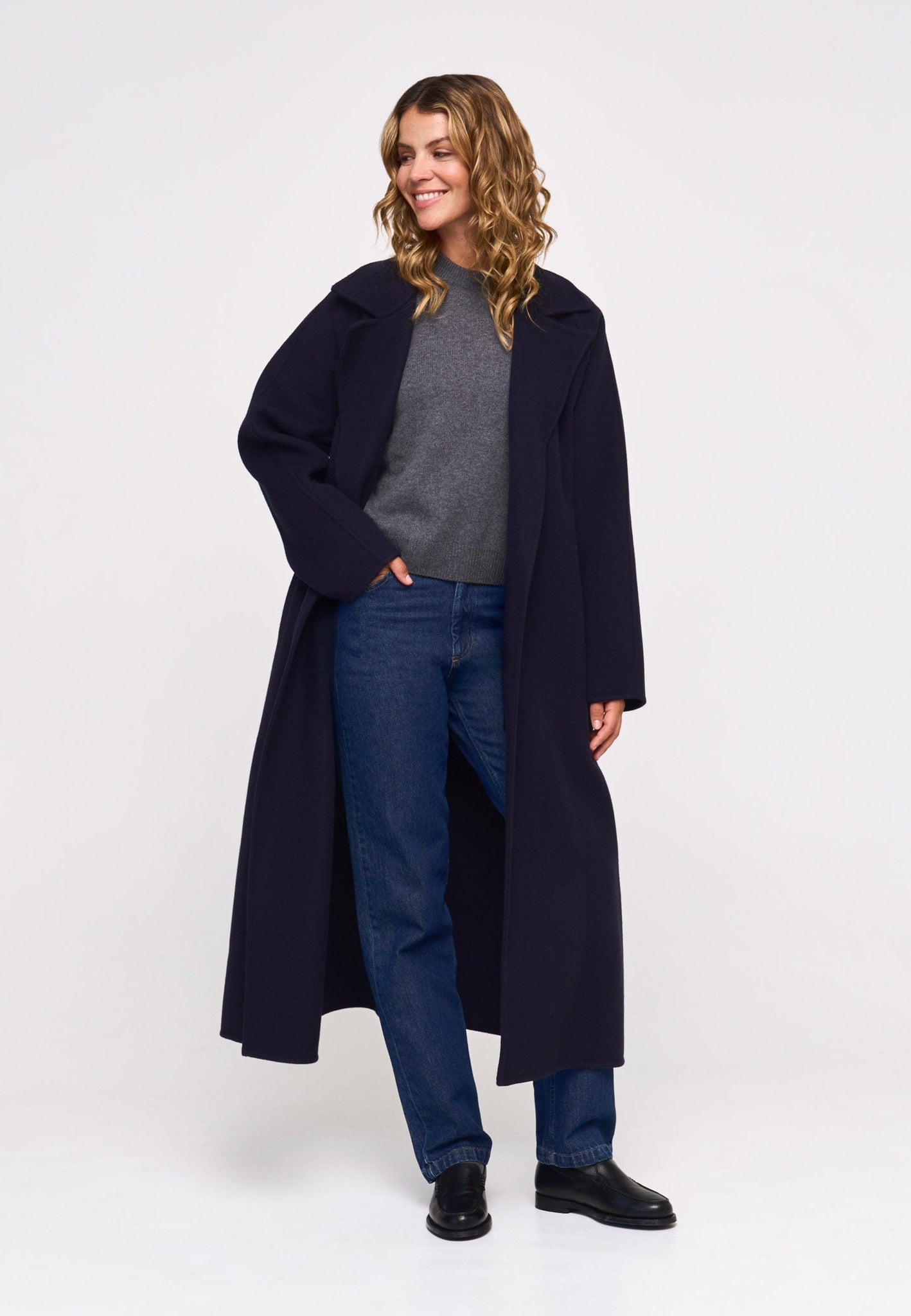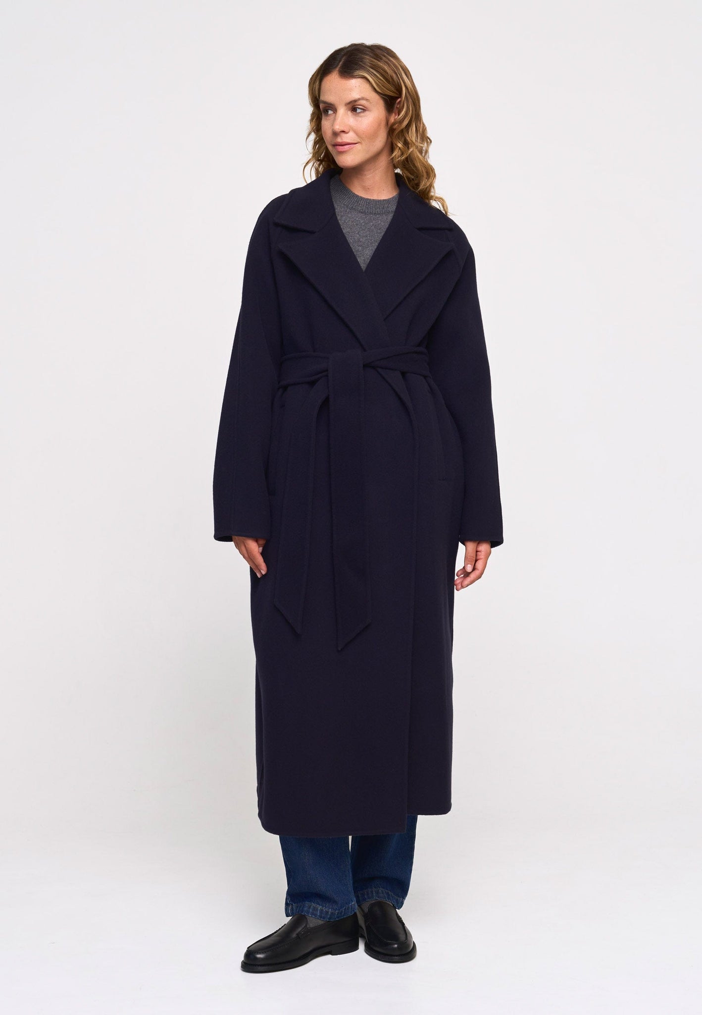 Long wrap coat in RWS-certified wool. Belted silhouette with a relaxed fit.