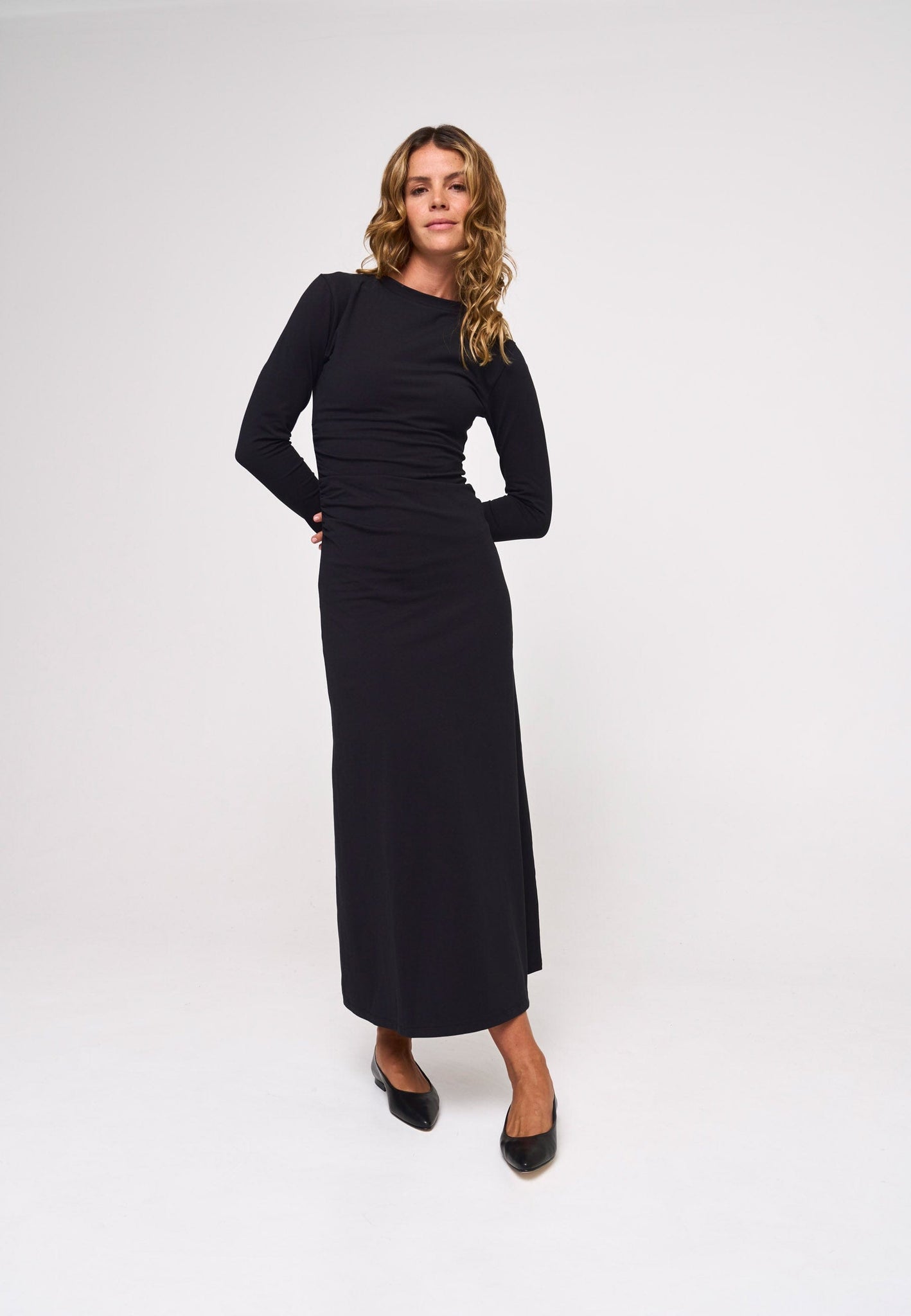 Long dress in organic cotton jersey with gathered detail at the waistline.