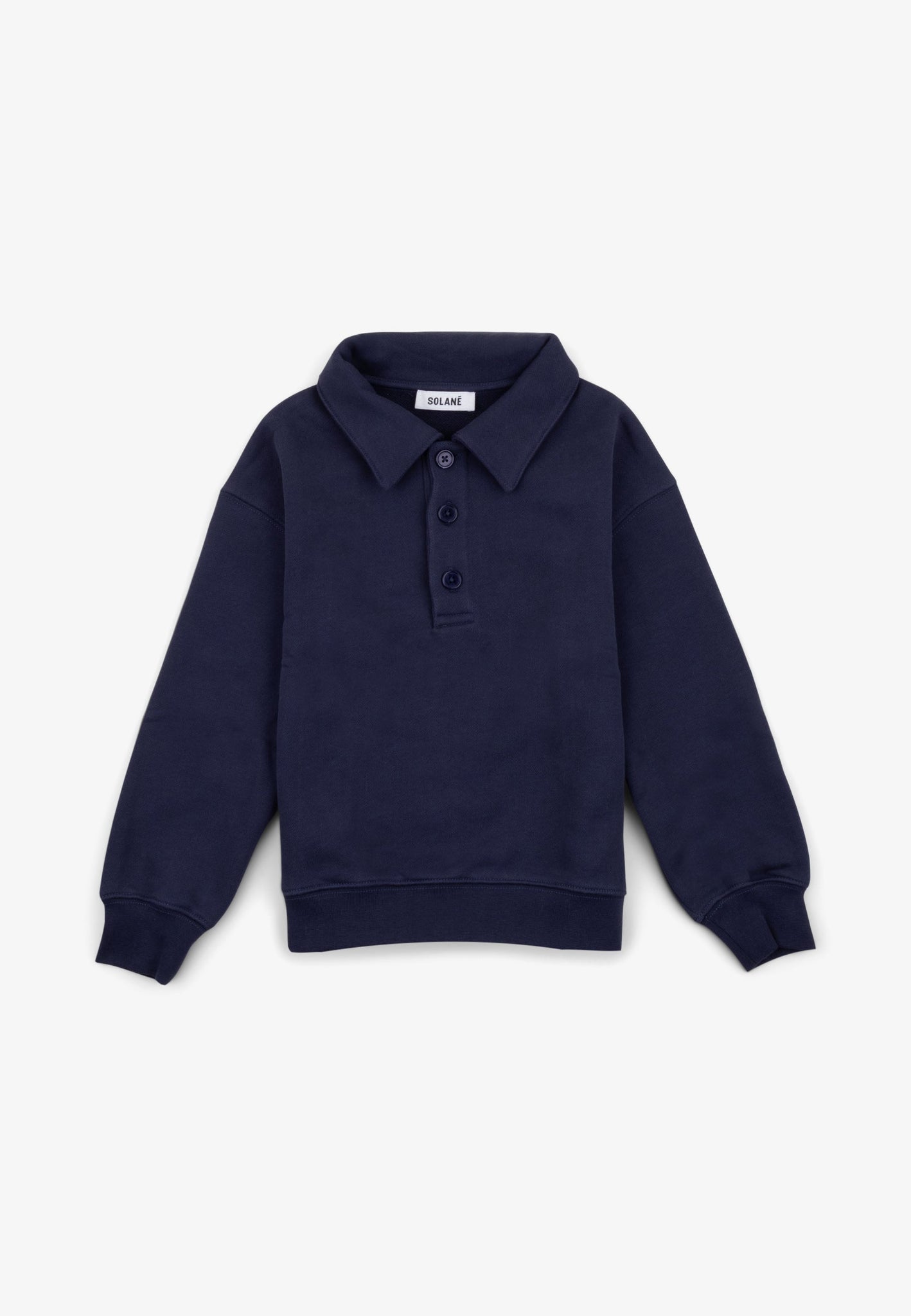 Organic cotton jersey polo sweater. Relaxed cut with rib hem, cuff and neckline.